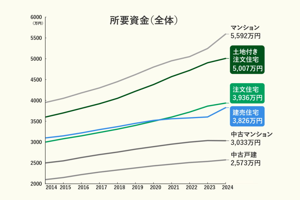 住宅金融支援機構の「2024年度フラット35利用者調査」によると、土地を含めた注文住宅の所要資金は、全国平均で5,007万円です 。昨今は材料費の高騰や、職人不足による人件費の高騰、円安などの影響もあり、住宅価格が年々上昇傾向にあります。同調査の2023年の所要資金は4,903万円と、1年で約100万円アップしている結果も、住宅価格の高騰を表しているでしょう。