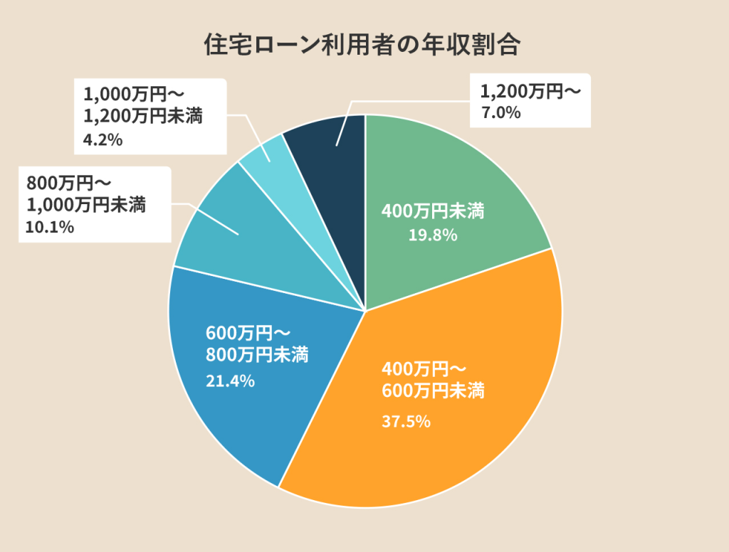「フラット35利用者調査」によると、住宅ローンを利用した土地込み注文住宅の購入者の世帯年収は全国平均で661万円でしたが、実際に1番多く利用しているのは「平均世帯年収400~600万円未満(37.5%)」の層です。平均世帯年収が1,200万円以上の利用者も7%いるため、平均値が底上げされていると考えられます。