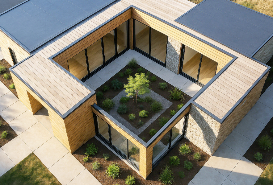 人気の理由は、都市部や住宅が密集したエリアでも 採光・通風・プライバシーを確保できること。建物で囲んだ中庭を設けることで、外からの視線を遮りながら自然光や風を取り込み、明るく開放的な住まいを実現できます。